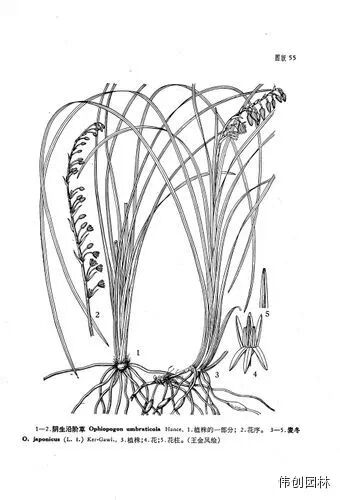 百合科多年生草本,成丛生长,高30厘米左右。叶丛生,细长,深绿色,形如韭菜。花茎自叶丛中生出,花小,淡紫色,形成总状花序。果为浆果,圆球形,成熟后为深绿色或黑蓝色。根茎短,有多数须根,在部分须根的中部或尖端常膨大成纺锤形的肉质块根,即药用的麦冬。